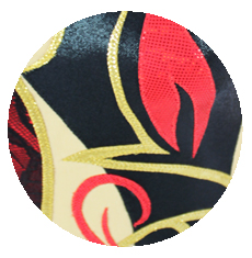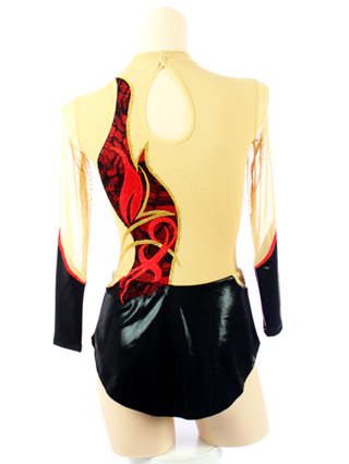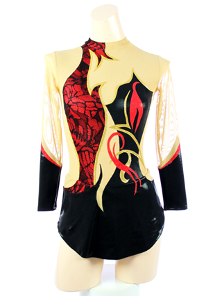 黒メタリックの光沢感がクールでカッコイイ競技用レオタード衣装です。前後右部分の模様はレースと赤ライクラのレイヤー(二重)仕様になっており、エレガントでゴージャスな印象も演出してくれます。赤ホログラムと金メタリックの模様がデザインのアクセントになっています。パンツは黒メタリックです。ベージュメッシュの身頃部分には内地を追加してあります。