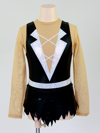 黒メタリックと白ホログラムの組み合わせがクールでカッコイイ新体操レオタードです。スカート裾のカッティングがデザインのアクセントになっています。パンツは黒メタリックです。身頃のメッシュ部分には内地が追加されています。