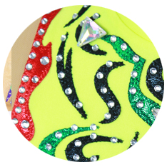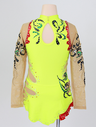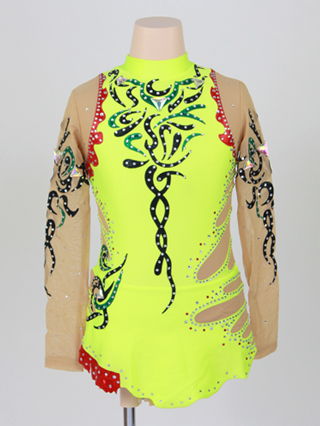 ネオンイエローライクラがビビッドで華やかな新体操レオタードです。黒メタリックと緑メタリックの模様と肩とスカート裾の赤メタリックがデザインのアクセントになっています。パンツはネオンイエローライクラです。身頃のベージュメッシュ部分には内地が付いています。