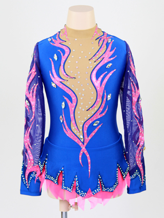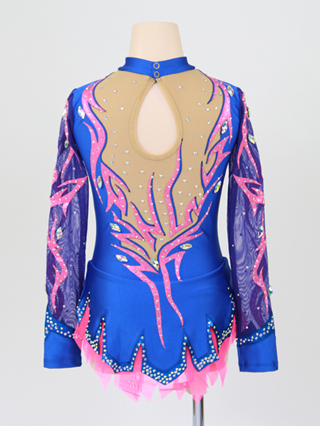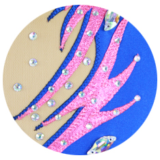 青ライクラをベースに、大小のクリスタルを贅沢に装飾したゴージャスな新体操レオタードです。ピンクメタリックの模様がデザインに躍動感をプラスしています。スカート裾と袖口の青メタリックの模様がデザインのアクセントになっています。スカートはネオンピンクメッシュとのレイヤー仕様、パンツは青ライクラです。青メッシュの袖がデザインをエレガントに演出しています。身頃のベージュメッシュ部分には内地が付いています。